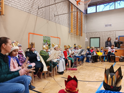 Die Religionslehrerinnen der Grundschule am Teutoburger Platz in Berlin haben ein Sternsingerprojekt ins Leben gerufen. In Berlin ist der Religionsunterricht ein freiwilliges Wahlfach, das an der Grundschule in ökumenischer Kooperation angeboten wird. Zehn Wochen lang beschäftigen sich die Klassen 1 bis 6 im Religionsunterricht mit den Inhalten der Sternsingeraktion: Sie lernen das Beispielland und die Lebenssituation der Kinder vor Ort kennen und erarbeiten das Thema. Die älteren Kinder dürfen ihr Sternsingerprojekt selbst mitgestalten. So entstanden bereits ein Konzert, ein Theaterstück und Podcasts. Manche Kinder organisieren sogar in ihrer Freizeit noch Bastelaktionen zum Sternsingerprojekt. Als Abschluss findet ein Sternsingertag statt, bei dem die Kinder selbstgemachte Dinge verkaufen und vorstellen, was sie gemeinsam erarbeitet haben. Gleichzeitig startet die Schule auf www. sternsinger.de eine Online-Spendenaktion, die auch auf der Schulwebsite beworben wird.