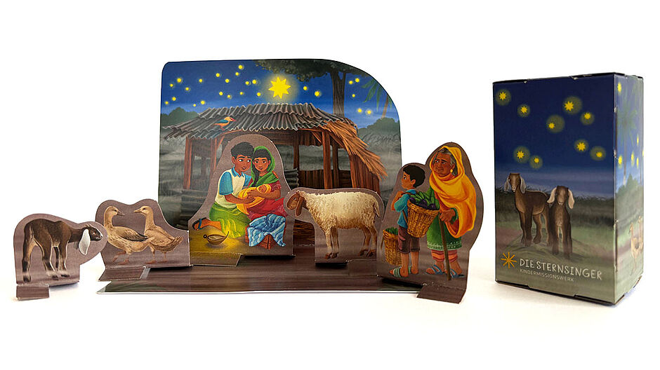Die Kinder können die Krippenszene, die in Bangladesch spielt, aufbauen und zugleich ihre Gaben in einem Spendenkästchen sammeln. Mit den Spenden werden weltweit Projekte für Kinder gefördert. Das Begleitheft enthält eine Vorlesegeschichte zur Krippe und kreative Anregungen für die Gestaltung der Advents- und Weihnachtszeit.