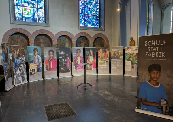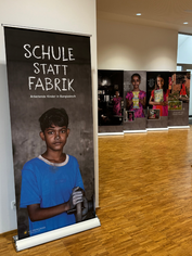 Im Mittelpunkt dieser Ausstellung stehen Tazim und Nour aus Bangladesch. Tazim musste schon mit zehn Jahren in einem Betrieb arbeiten, der Aluminiumschüsseln produziert. Nour war erst sechs Jahre, als sie begann, in einer Snackfabrik zu arbeiten. Ihre Kinder zur Arbeit zu schicken, war für die Eltern ein leidvoller Schritt. Doch die Not der Familien war zu groß. Tazims Eltern und Nours alleinerziehende Mutter waren krank. In Bangladesch gibt es keine staatliche Kranken- und Sozialversicherung.