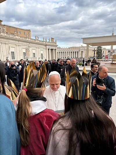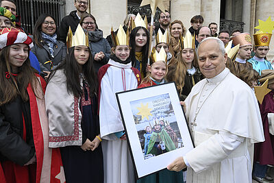 Die vier Sternsingerinnen Mia (14), Pia (10), Theresa (13) und Anna (13) aus der Pfarrei St. Franziskus in Marl (Bistum Münster) feierten am Donnerstag, 1. Januar, den Neujahrsgottesdienst mit Papst Leo XIV. im Petersdom mit. Gemeinsam mit 19 weiteren Sternsingerinnen und Sternsingern aus der Schweiz, aus Österreich, Italien, der Slowakei und aus Ungarn, die rund um den Jahreswechsel zu Gast in der italienischen Hauptstadt waren, nahmen sie am Silvestertag an der Generalaudienz des Heiligen Vaters auf dem Petersplatz teil. Papst Leo XIV. nahm sich dabei Zeit für die engagierten Mädchen und Jungen. Die stellten dem Heiligen Vater ihr Engagement beim Dreikönigssingen vor und überreichten ein gerahmtes Foto von Sternsingerinnen und Sternsingern mit dem Segen „Christus mansionem benedicat“.