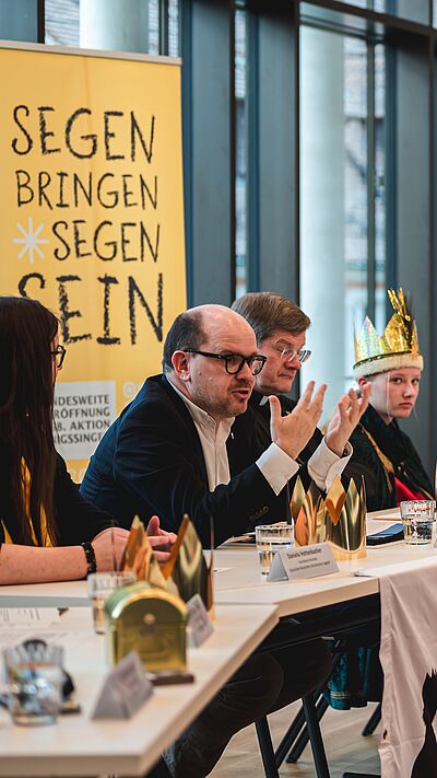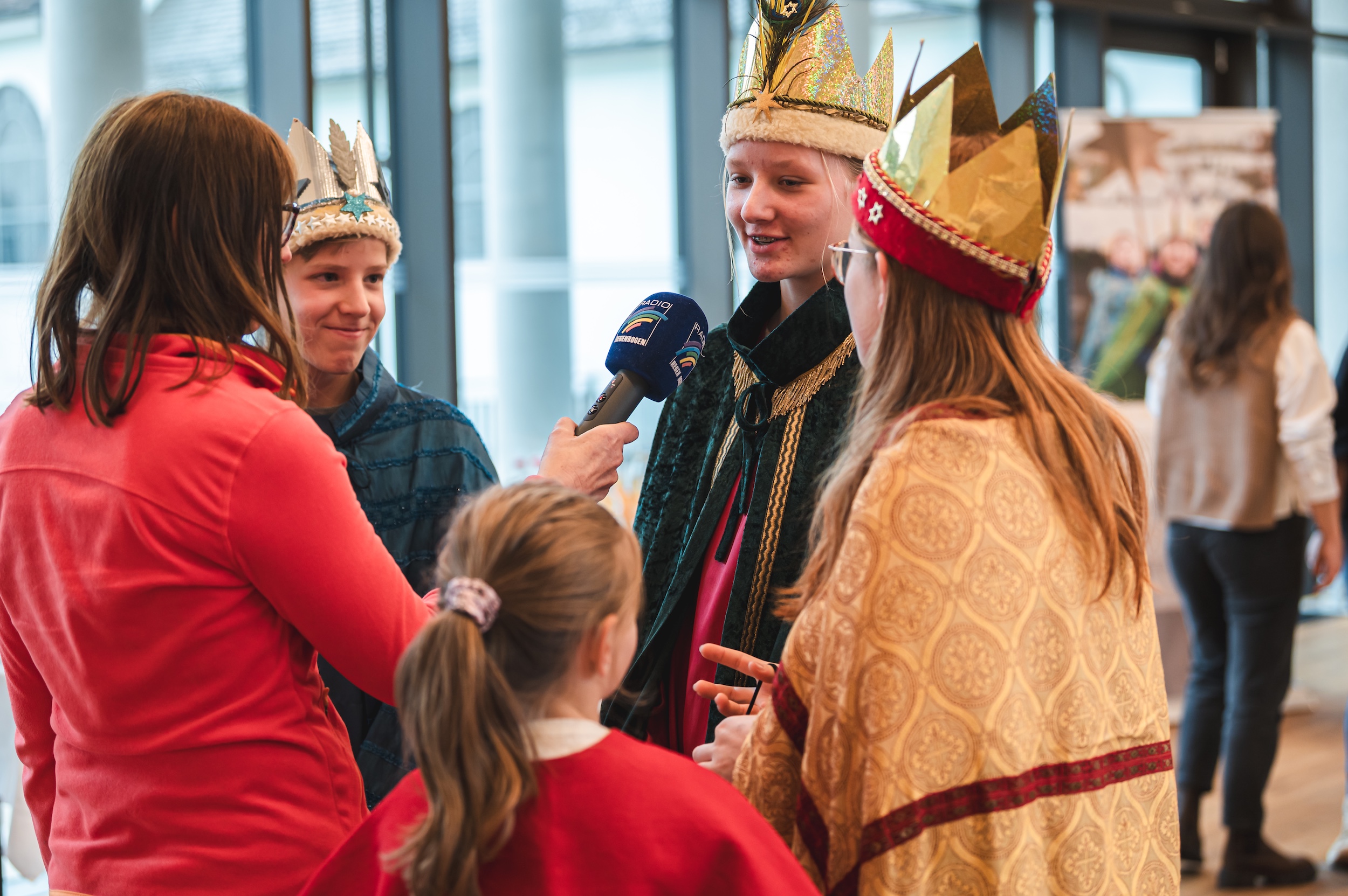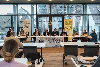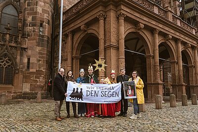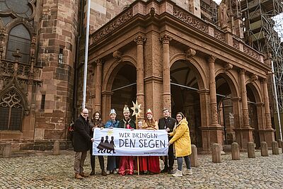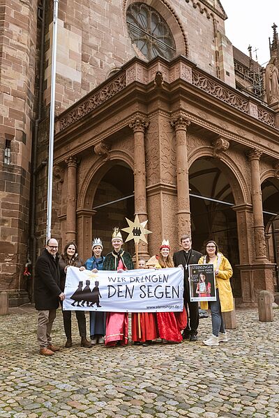 Freuen sich auf die bundesweite Eröffnung der 68. Aktion Dreikönigssingen am 30. Dezember 2025 in Freiburg: (v.l.n.r.) Pfarrer Dirk Bingener, Präsident des Kindermissionswerks ,Die Sternsinger', Marie-Christine Meier, Diözesanleiterin des BDKJ-Diözesanverbands Freiburg, Sternsinger Samuel (12) und die Sternsingerinnen Emma (13), Larissa (10), Lisa (13) aus der Gemeinde St. Blasius in Freiburg-Zähringen, Erzbischof Stephan Burger, sowie Daniela Hottenbacher, Bundesvorsitzende des Bundes der Deutschen Katholischen Jugend (BDKJ).