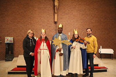 Marion Krebs, Emily (13) Sam (13) Annalena (15) und Gemeindereferent Christoph Mainka (von links) aus der Pfarrei St. Knud in Husum, Nordfriesland/Schleswig-Holstein, reisen im Januar zu den Sternsinger-Empfängen nach Brüssel. Mit dabei ist dann auch Jakob (13), der beim Fototermin erkrankt fehlte.