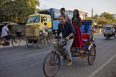"Für mich ist dabei aber ein Traum in Erfüllung gegangen, denn Rikschafahren im turbulenten Straßenverkehr wollte ich schon immer mal ausprobieren. Doch weil wir dabei gefilmt wurden und ich meine zwei Fahrgäste, Tazim und Nour verdeckt habe, weil die ja hinter mir saßen, und es für unseren Kameramann schwer war, sie zu filmen, mussten die beiden zur Begrüßung kurz aufstehen."