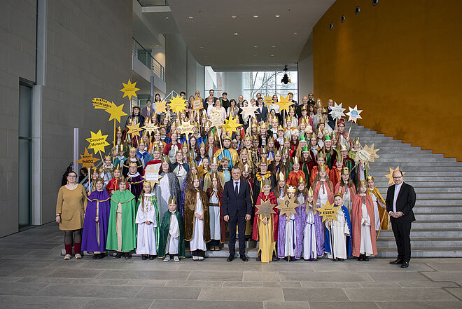 Seit 1984 bringen die Sternsingerinnen und Sternsinger jedes Jahr ihren Segen ins Bundeskanzleramt. Jeweils vier Königinnen und Könige aus allen 27 Bistümern repräsentieren dabei alle Kinder und Jugendlichen, die sich bundesweit an der Aktion beteiligen.