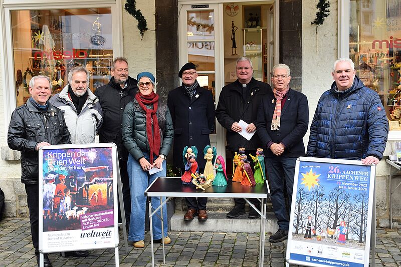 Eröffneten die 31. Krippenausstellung (v.l.n.r.): Stefan Rueben (Kindermissionswerk ,Die Sternsinger‘), Dompropst Rolf-Peter Cremer, Markus Offner (Leiter der Stabsabteilung Kirche im Dialog im Bischöflichen Generalvikariat), Anke Reermann (missio-Diözesanreferentin im Bistum Aachen & Geschäftsführung „weltweit am Dom“), Bürgermeister Dr. Ralf Otten (Stadt Aachen), Generalvikar Pfr. Jan Nienkerke (Bistum Aachen), Thomas Bürgerhausenn (Leiter „weltweit am Dom“, Organisator der Ausstellung), Ingo Jungen (Landesgemeinschaft der Krippenfreunde im Rheinland und Westfalen e.V.). Foto: missio Aachen