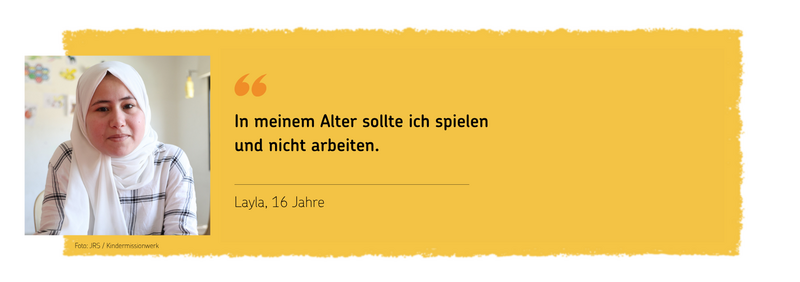 Layla ist 16 Jahre alt und hat ihre Kindheit in Fabriken und Nähereien verbracht. Denn ihre Familie ist auf das Geld angewiesen. Sie erzählt: „Ich wünschte, die Situation meiner Familie wäre besser. Ich möchte, dass wir ein Zuhause haben, das in gutem Zustand ist. Ich wünschte, ich müsste nicht arbeiten.“
