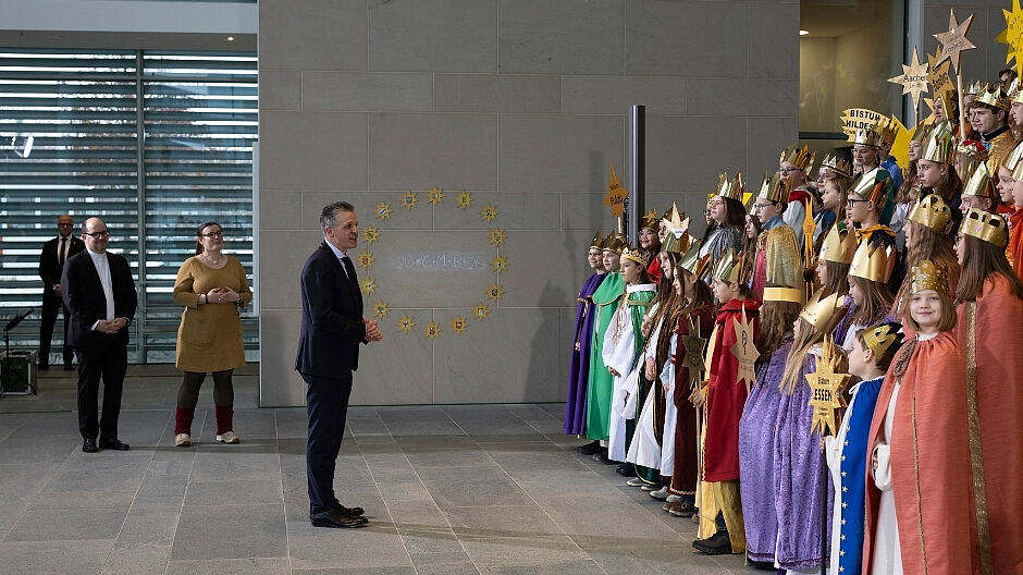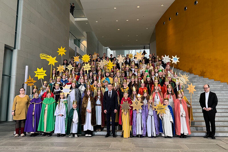 Mit großen Sternen, glänzenden Kronen sind am Dienstagnachmittag 108 Sternsingerinnen und Sternsinger ins Bundeskanzleramt eingezogen. Empfangen wurden sie herzlich von Minister Thorsten Frei, Chef des Bundeskanzleramts, der tolle Worte für das Engagement der angereisten Kinder und Jugendlichen fand: "Ich finde großartig, wie ihr das macht. Es ist echte Nächstenliebe. Und es überträgt das, was wir in den Kirchen machen, in das echte Leben. Ihr seid damit ein Vorbild für viele Gleichaltrige. Und ihr seid auch ein echtes Vorbild für viele Erwachsene."