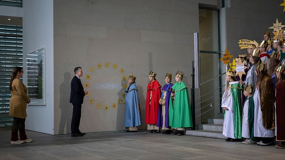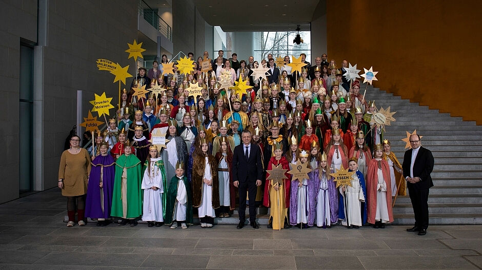 Seit 1984 bringen die Sternsingerinnen und Sternsinger jedes Jahr ihren Segen ins Bundeskanzleramt. Jeweils vier Königinnen und Könige aus allen 27 Bistümern repräsentieren dabei alle Kinder und Jugendlichen, die sich überalll in Deutschland in diesen Tagen auf ihrem Weg zu den Menschen machen, um zu betonen: Kinder gehören in die Schule und nicht in die Frabrik.