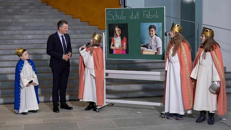 Aus allen Himmelsrichtungen waren die engagierten Königinnen und Könige nach Berlin gekommen und hatten eine wichtige Botschaft dabei. „Schule statt Fabrik – Sternsingen gegen Kinderarbeit“ heißt das Motto der aktuellen Aktion Dreikönigssingen. Die Sternsingerinnen und Sternsinger Liuba (16), Marie (12), Rebecca (11) und Sebastian (9) aus der Pfarrei St. Medardus in Lüdenscheid (Bistum Essen) gingen vor Thorsten Frei ins Detail: Am Beispiel von Tazim und Nour, zwei ehemals arbeitenden Kindern aus Bangladesch, machten die Vier deutlich: „Ein Ausweg aus der Kinderarbeit ist die Schule. Denn wenn Kinder zur Schule gehen, können sie später einen guten Beruf erlernen, um ihre Familie zu ernähren. Und dann können irgendwann auch ihre Kinder zur Schule gehen.“ Abschließend überreichten sie Minister Thorsten Frei ein symbolträchtiges Geschenk – eine kleine Schultafel mit der Aufschrift: „Kinderrechte sind Chefsache!“