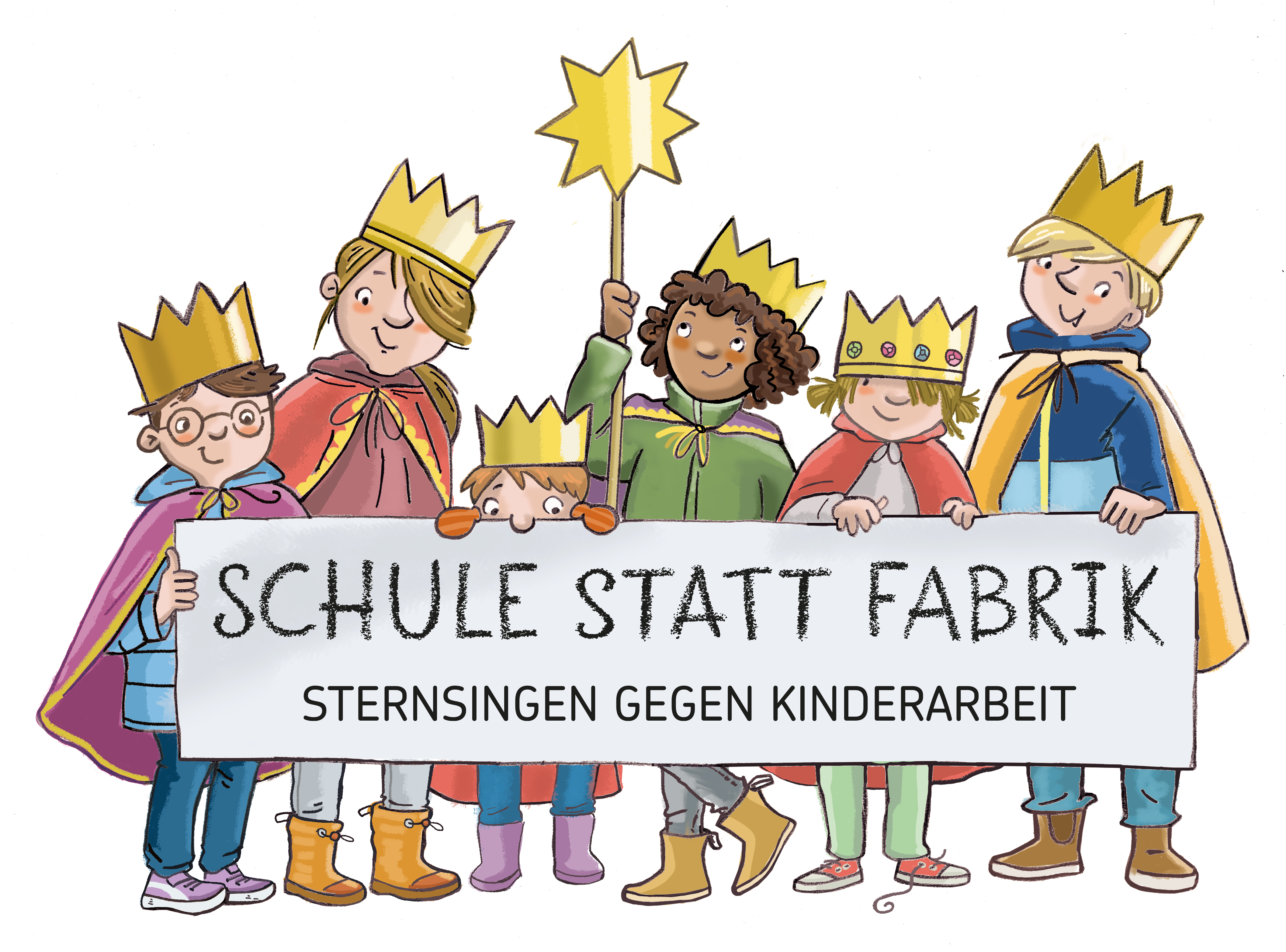 Grafik: Sternsinger tragen Banner ,Schule statt Fabrik'