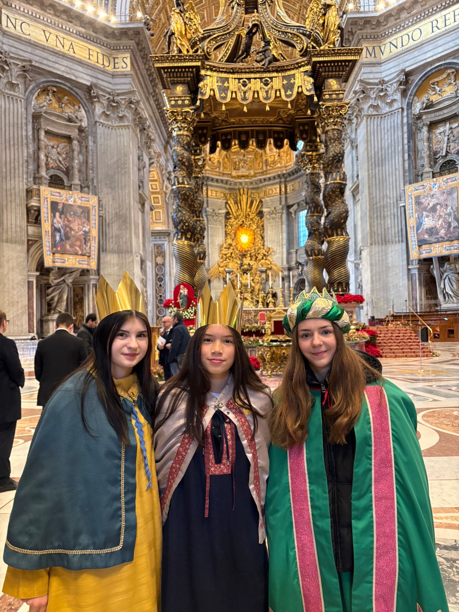Neujahrsgottesdienst mit Papst Leo XIV. Mia (14) und Anna (13) aus Marl brachten am Neujahrstag gemeinsam mit der österreichischen Sternsingerin Clara (14, von links) aus dem Burgenland die Gaben zu…