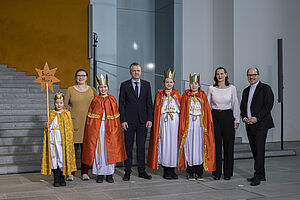 Die Sternsingerinnen und Sternsinger Mirja (11), Marie-Anne (14), Matthias (13) und Jan-Claus (13) sowie Begleiterin Kerstin Fenski aus der Pfarrgemeinde St. Annen in Berlin vertraten das Erzbistum Berlin am Dienstagnachmittag beim Sternsingerempfang zur 68. Aktion Dreikönigssingen im Bundeskanzleramt. Zum Gruppenfoto mit Thorsten Frei, Chef des Bundeskanzleramts, stellten sie sich gemeinsam auf mit Pfarrer Dirk Bingener, Präsident des Kindermissionswerks ‚Die Sternsinger‘, und Daniela Hottenbacher, Bundesvorsitzende des Bundes der Deutschen Katholischen Jugend (BDKJ). Foto: Mika Väisänen / Kindermissionswerk