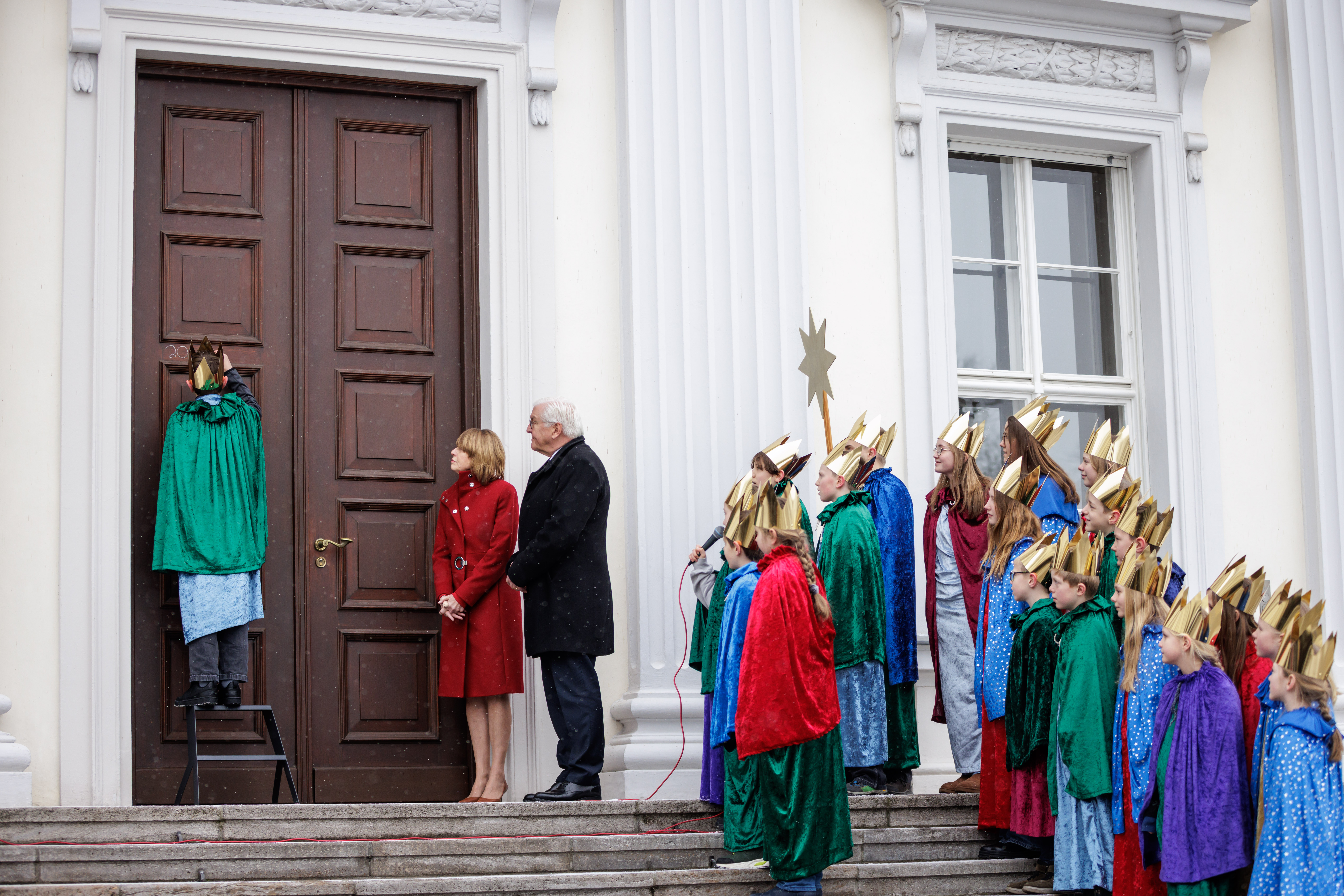 Bundespräsident Frank-Walter Steinmeier und seine Frau Elke Büdenbender haben am Dreikönigstag Sternsingerinnen und Sternsinger aus dem Erzbistum Paderborn im Schloss Bellevue empfangen. Sternsinger Johannes (12) schrieb dabei mit weißer Kreide den Segen an das Schlossportal. Die elf Mädchen und neun Jungen aus der Pfarrei St. Ewaldi in Dortmund-Aplerbeck waren stellvertretend für alle engagierten Königinnen und Könige, die in diesen Tagen deutschlandweit Spenden für benachteiligte und Not leidende Kinder in aller Welt sammeln, nach Berlin gereist.