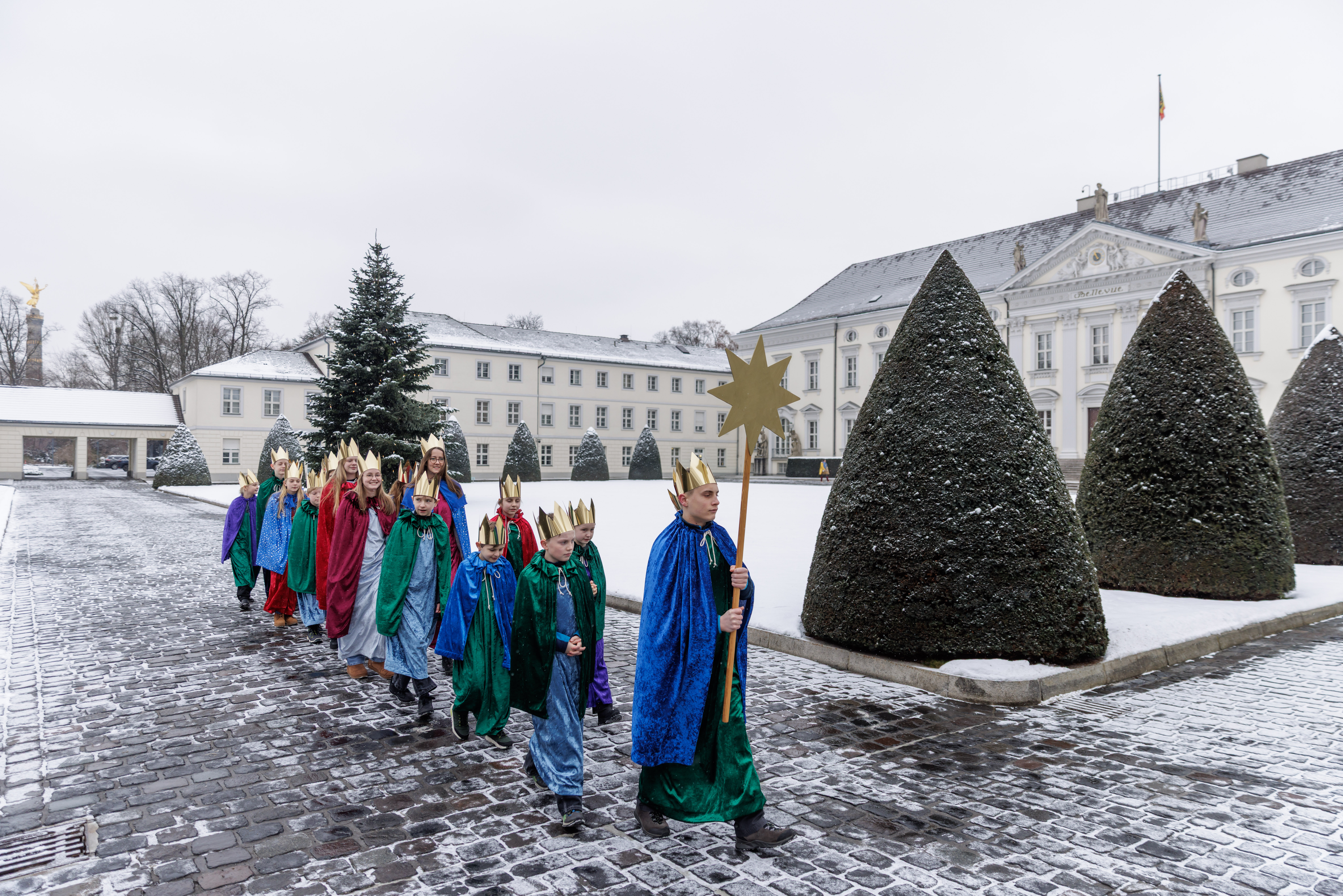 Perfekte Kulisse im Schnee: Sternsingerinnen und Sternsinger auf dem Weg zum Schloss Bellevue, wo Bundespräsident Frank-Walter Steinmeier und seine Frau Elke Büdenbender schon auf sie warteten.