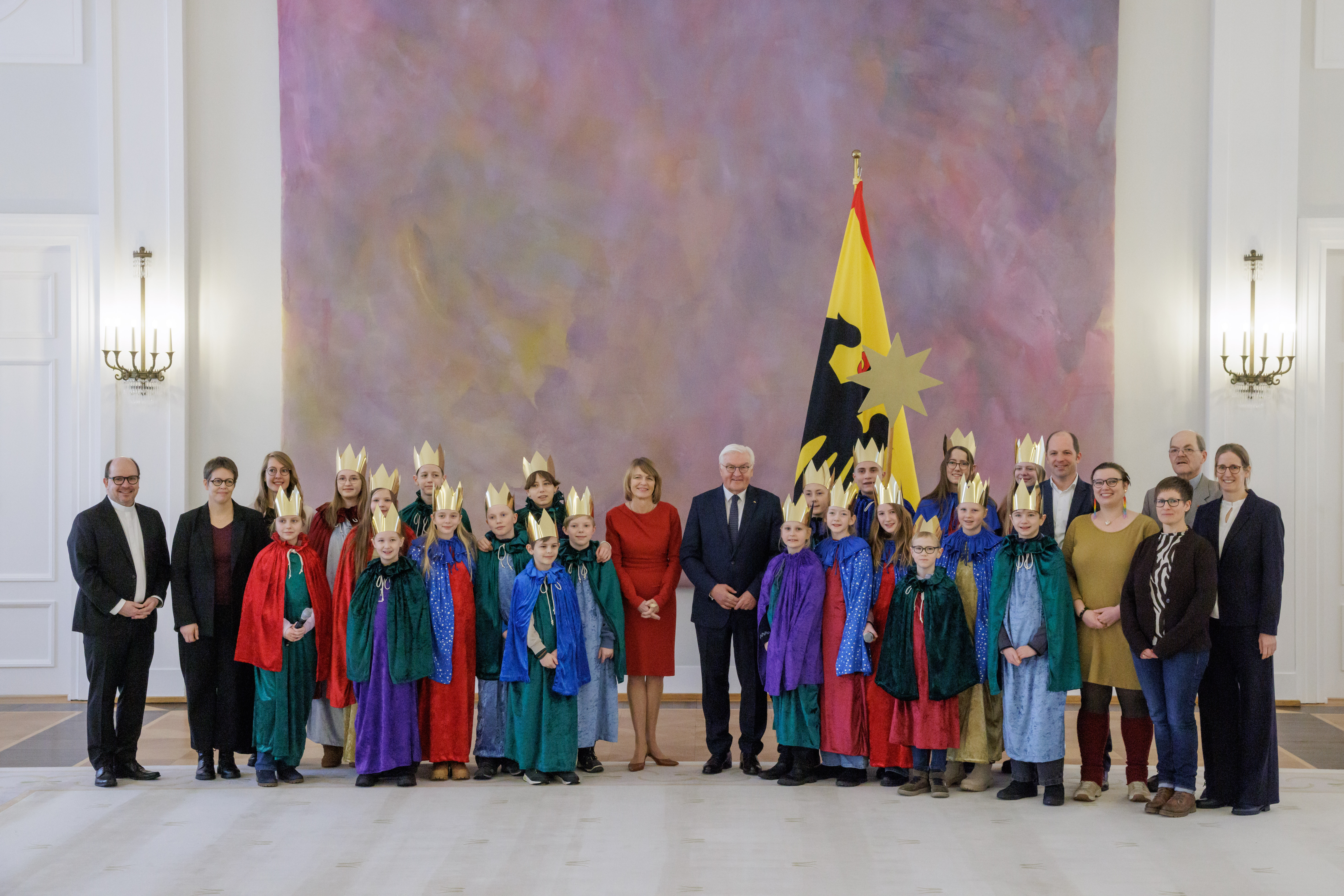 Bundespräsident Frank-Walter Steinmeier und seine Frau Elke Büdenbender haben am Dreikönigstag Sternsingerinnen und Sternsinger aus dem Erzbistum Paderborn im Schloss Bellevue empfangen. Die elf Mädchen und neun Jungen aus der Pfarrei St. Ewaldi in Dortmund-Aplerbeck waren stellvertretend für alle engagierten Königinnen und Könige, die in diesen Tagen deutschlandweit Spenden für benachteiligte und Not leidende Kinder in aller Welt sammeln, nach Berlin gereist. Begleitet wurden die Mädchen und Jungen beim Empfang im Schloss Bellevue von Pfarrer Dirk Bingener, Präsident des Kindermissionswerks ‚Die Sternsinger‘ (links), und Daniela Hottenbacher, Bundesvorsitzende des Bundes der Deutschen Katholischen Jugend (BDKJ) (4.v.r.), als Vertreter der bundeweiten Träger der Aktion Dreikönigssingen.