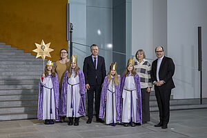 Die Sternsingerinnen Emilia (10), Isabella Esperanza (9), Lia Joline Lou (9) und Sarah (9) sowie Begleiterin Maria Soll aus der Katholischen Schule St. Elisabeth, Bergedorf, in der Pfarrei Heilige Elisabeth in Hamburg vertraten das Erzbistum Hamburg am Dienstagnachmittag beim Sternsingerempfang zur 68. Aktion Dreikönigssingen im Bundeskanzleramt. Zum Gruppenfoto mit Thorsten Frei, Chef des Bundeskanzleramts, stellten sie sich gemeinsam auf mit Pfarrer Dirk Bingener, Präsident des Kindermissionswerks ‚Die Sternsinger‘, und Daniela Hottenbacher, Bundesvorsitzende des Bundes der Deutschen Katholischen Jugend (BDKJ). Foto: Mika Väisänen / Kindermissionswerk