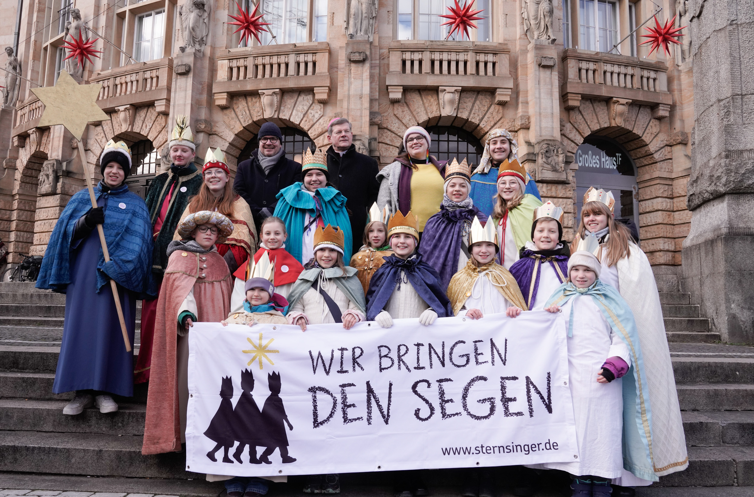 Die Sternsingerinnen und Sternsinger sind bereit: Große Freude bei der Bundesweiten Eröffnung in Freiburg auch bei Pfarrer Dirk Bingener, Präsident des Kindermissionswerks ‚Die Sternsinger‘, dem Freiburger Erzbischof Stephan Burger und Daniela Hottenbacher, Bundesvorsitzende des Bundes der Deutschen Katholischen Jugend (BDKJ, von links).